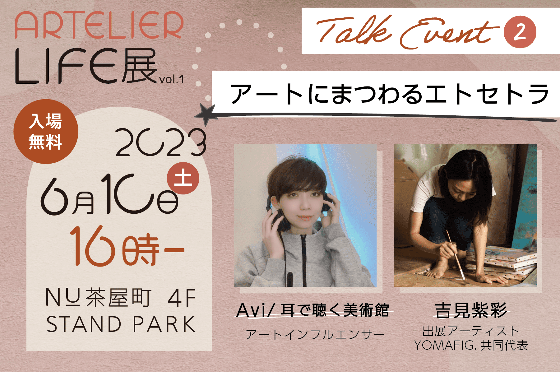 今をときめくアートインフルエンサーのAviさん、出展アーティストの吉見紫彩さんを迎え、注目したいアートジャンルや動向、お仕事の魅力、アートと生活、他分野との接合といったアートを楽しむためコツやアドバイスなどなど(エトセトラ)をカジュアルに談義します。